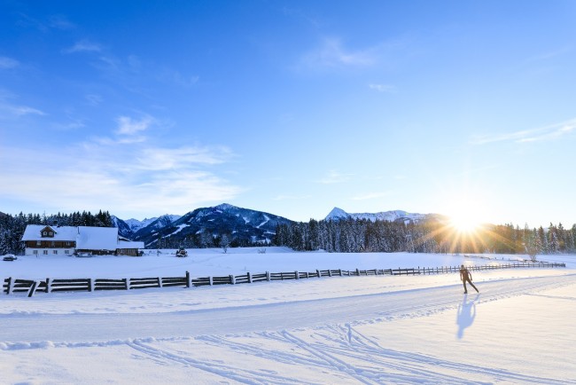 Für Langlauffans ist Ramsau am Dachstein ein wahres Paradies. Direkt vor dem Haus beginnt das Loipennetz, das Ihnen den Zugang zu insgesamt 220 Kilometern bestens präparierter Sport- und Skatingloipen bietet. Täglich werden diese Loipen gespurt und gepflegt, um Ihnen ein optimales Langlauferlebnis zu garantieren. Die Loipentickets können bequem bei uns im Haus erworben werden – Kinder bis zum 15. Geburtstag fahren kostenlos!